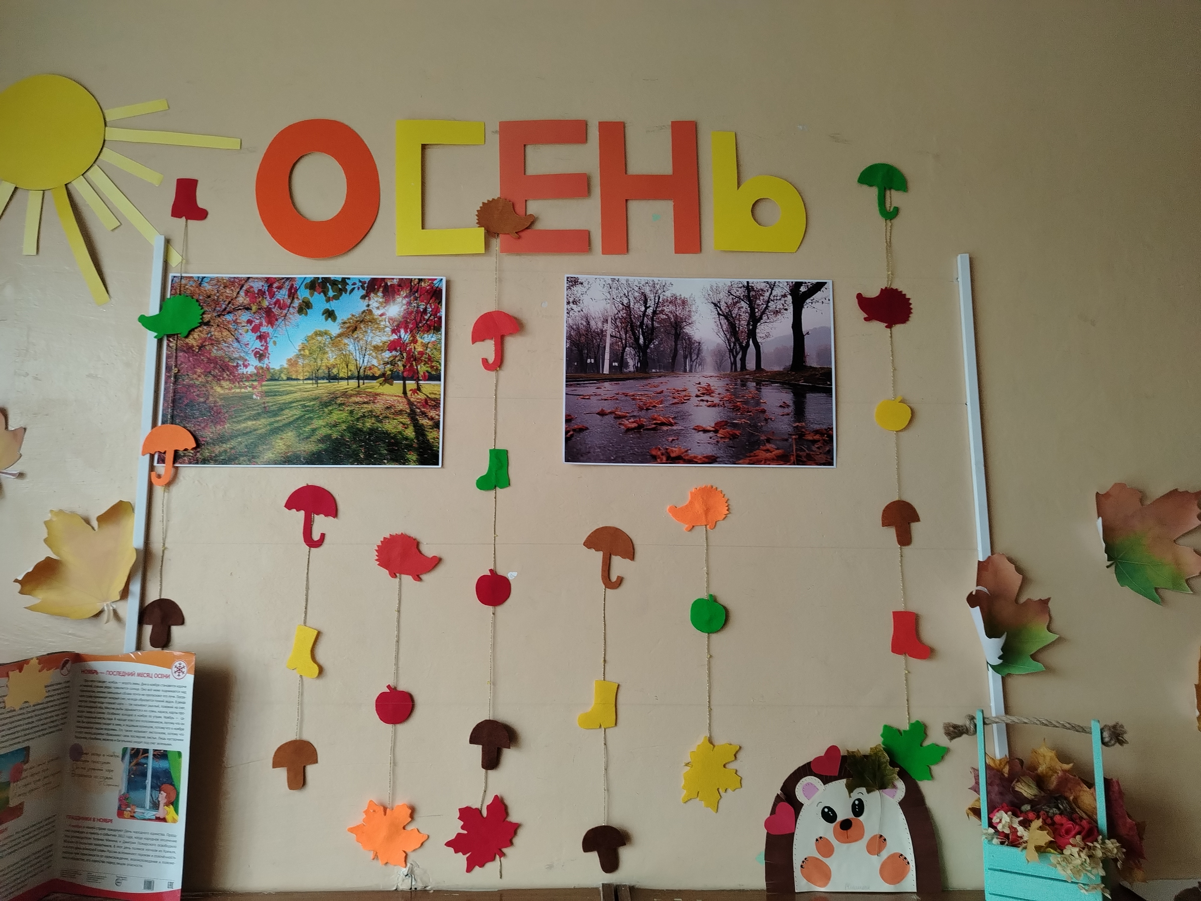Воспитанники под руководством воспитателей играли в дидактические игры «Чудесный осенний мешочек», «Разложи и посчитай», «Что нам осень принесла». На прогулке дети наблюдали за изменением в природе, собирали осенние букеты. Повторяли правила поведения в лесу, как себя надо вести что бы не навредить природе. С детьми проведены беседы «Золотая осень»; «О труде людей осенью», рассматривание сюжетных картин «Осенний день», «Труд людей осенью», «Разноцветная осень». Красоту осенней природы воспитанники групп учились подмечать разучивая стихи и песни. Все это помогло детям отобразить осенние впечатления в рисунках и поделках. С помощью нетрадиционных изобразительных материалов ребята передали красоту осеннего дерева, создали из пластилина осенние корзинки.